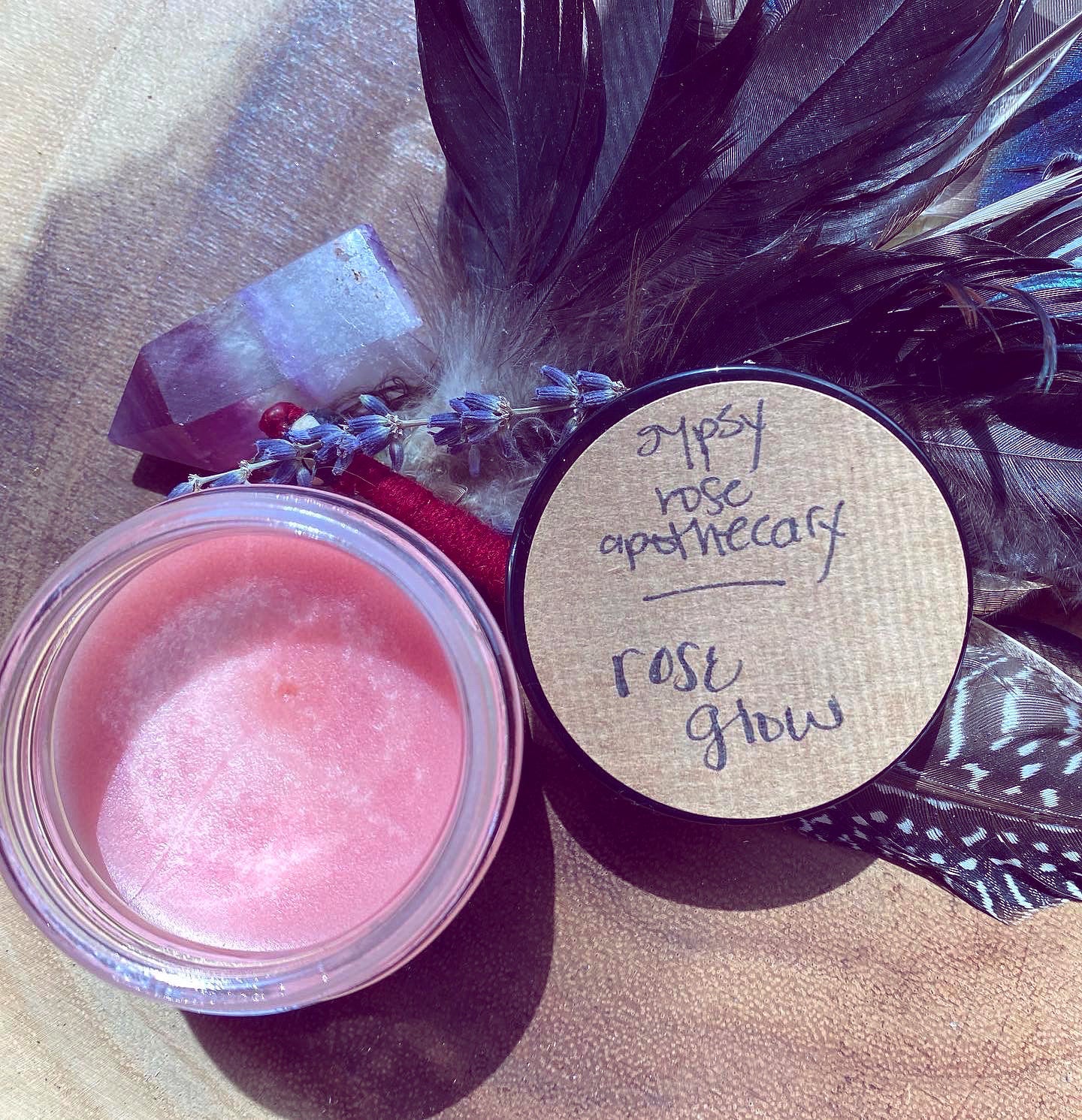a super hydrating, tinted rose and mango butter salve, used to condition and highlight your cheeks. Mixed with rose essential oils, rose hip seed oil, carrot seed oil, tulsi essential oil, organic calendula sunflower oil, organic rose jojoba oil, and pink mica.